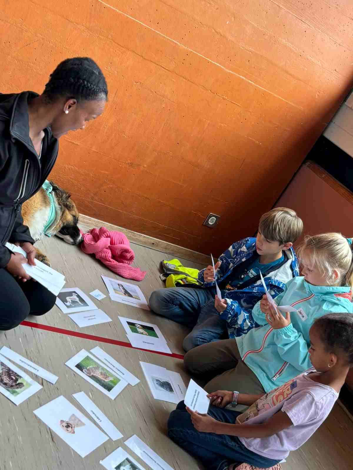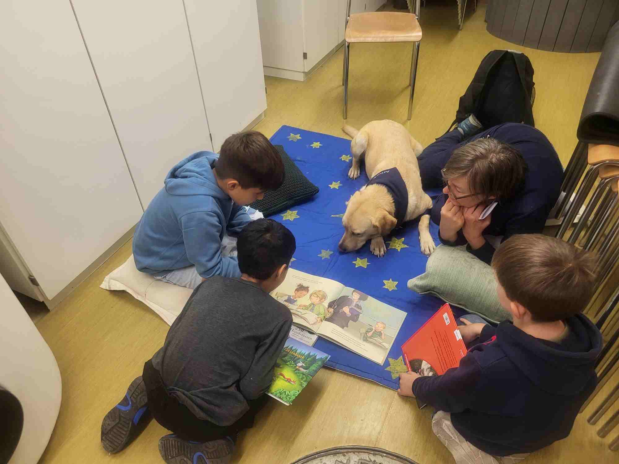 Am Freitagnachmittag, den 12. September durften die ältesten Basisstufenkinder einen Lesenachmittag mit Therapiehunden verbringen. Es waren 12 Therapie Teams, bestehend aus je einem Hund und einem Hundebesitzer. Diese Teams standen auf dem Pausenplatz in Teret. Fürs erste Kennenlernen konnten die Kinder durch diese Hunde-Mensch Grüppchen durch gehen. Dabei wurden die Kinder gebeten den Hundebesitzern die Hand zu geben und ihren eigenen Namen zu nennen. Danach standen die Kinder in einem Abstand zueinander auf dem Platz still und wurden von den Hunden und deren Gefährten besucht. Ein kurzes Beschnuppern, ein Blick von Hundeaugen in Kinderaugen.