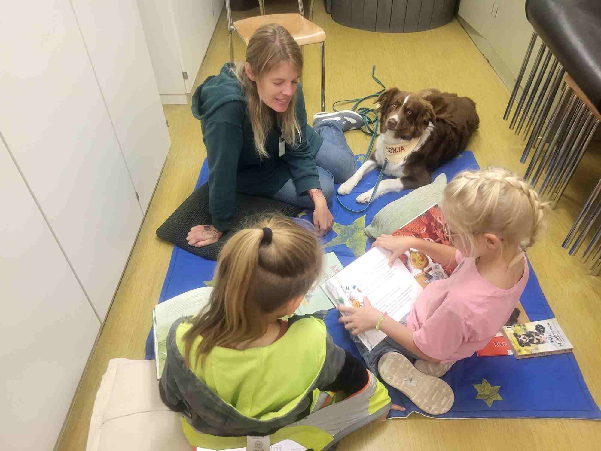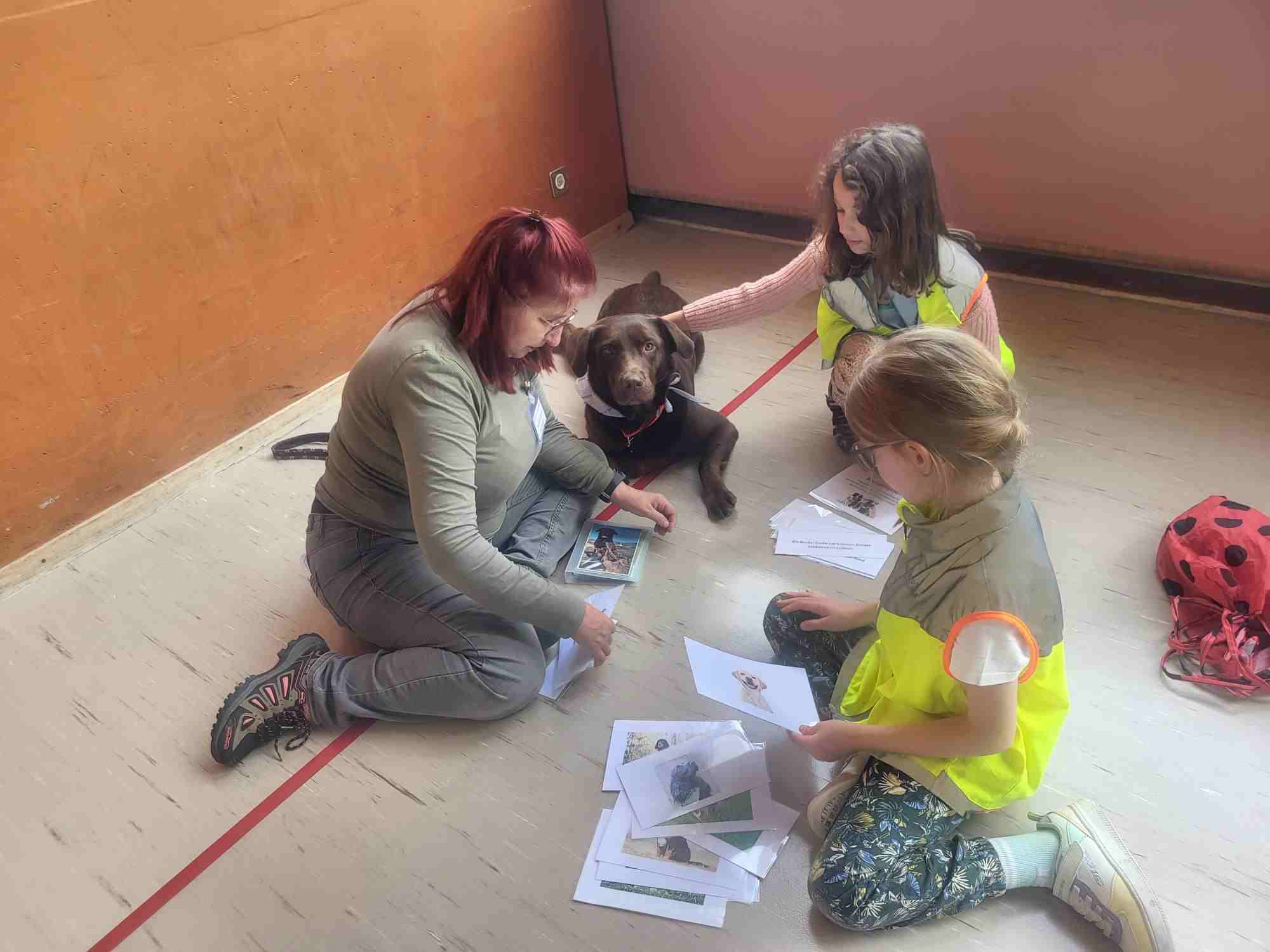 Für den weiteren Nachmittag wurden je zwei Kinder einem Hundeteam zugeordnet und diese verbrachten dann ihre Zeit zusammen an verschiedenen Posten, bei denen es ums Lesen und das Kennenlernen der Hunde ging.